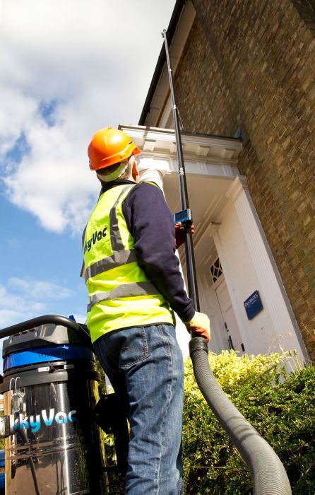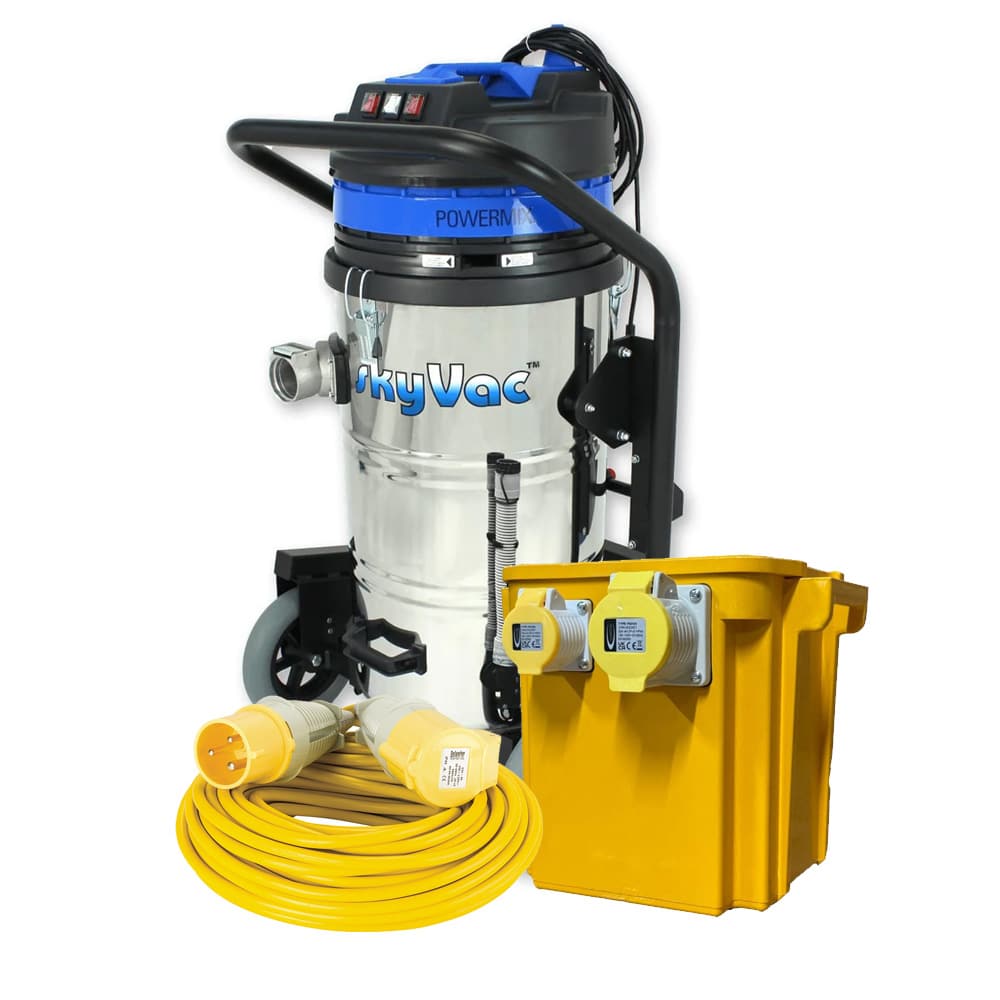 Heavy duty gutter vacuum specially developed for gutter cleaning. With the use of the correct high reach carbon fibre poles, it allows the user to quickly and efficiently clean out wet or dry gutters up to 12 metres or 40ft. This means that three storey buildings can be cleaned from ground level. Unique Skyvac PowerMix gives up to 50% more power than other machines. Tipping chassis for easy emptying. All-terrain steel chassis with stainless steel container.