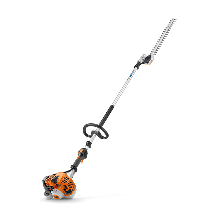 Long reach petrol hedge trimmer that is 2.4m in length to reach tall hedges with ease. The 600mm blade will easily cut established hedges and the 2 stroke petrol engine is ideal for working in noise sensitive areas. It features an easy start system and a loop handle for ease of use and stability. The cutter bar can be adjusted to reach over tall hedges and the double-sided cutting blades make easy work of thicker branches.