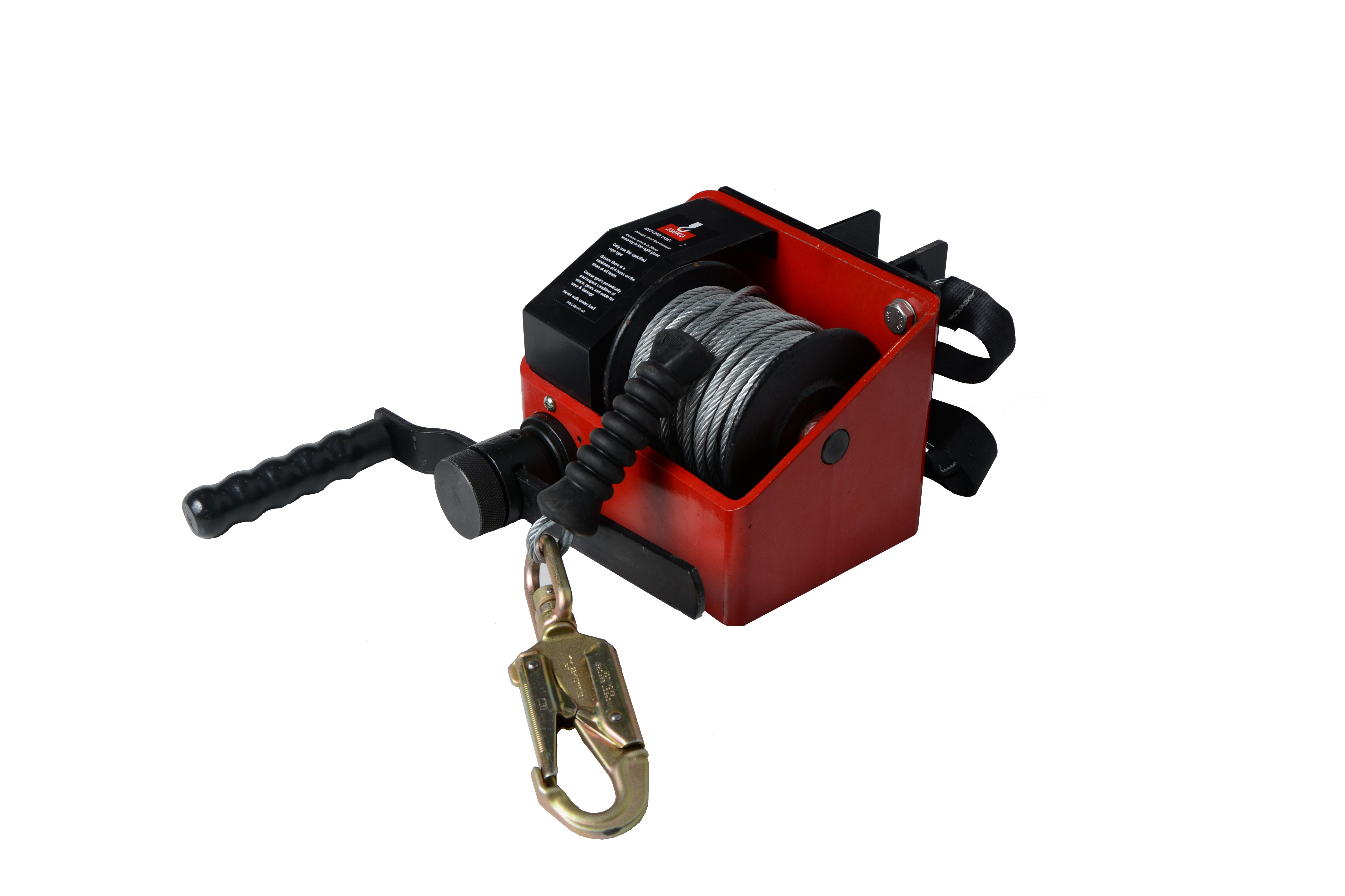 Man riding winch that fits a tripod for use in confined spaces and manhole shafts. This man riding winch is used when no aids for descent are present. It can be used to lower both personnel and work materials and it has a maximum lift capacity of 250kg. It features a 20m cable and a worm drive winch.
