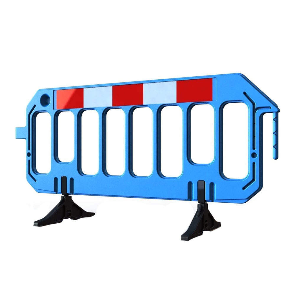 Blue safety barrier system for groundworks, roadworks or temporary excavations. Suitable for use on the railway. 2-metre sections with a highly reflective panel on top. Linking system design creates secure joints even on uneven ground, over kerbs, up slopes and rough terrain. Unlocked or locked mode configurations to prevent unauthorised dismantling. Complies with all mandatory regulations and BS7818 specifications chapter 8 hire for pedestrian restraint systems so can be used for event management and pedestrian control usage.